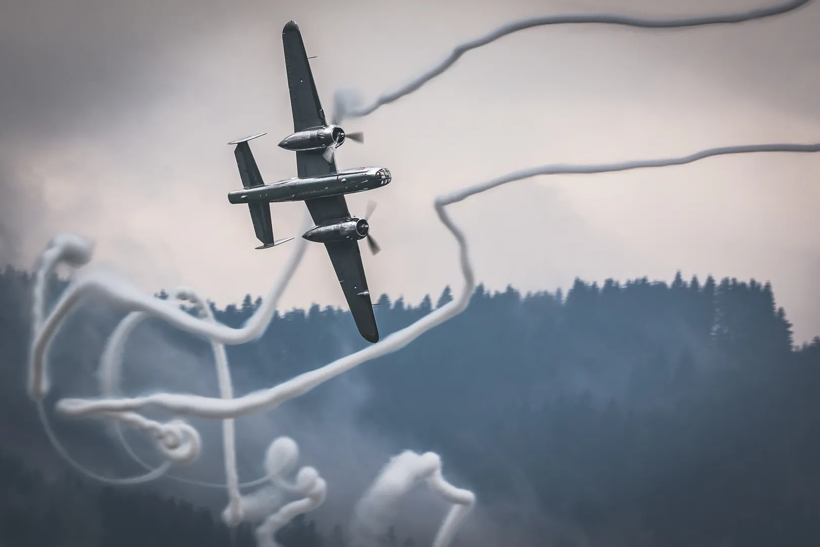 Du fliegst die B-25 als Lead in der großen Formation mit den Alpha Jets, der Lightning, der Corsair und der T-28 an deinen Flügeln. Was sind dabei die Herausforderungen?